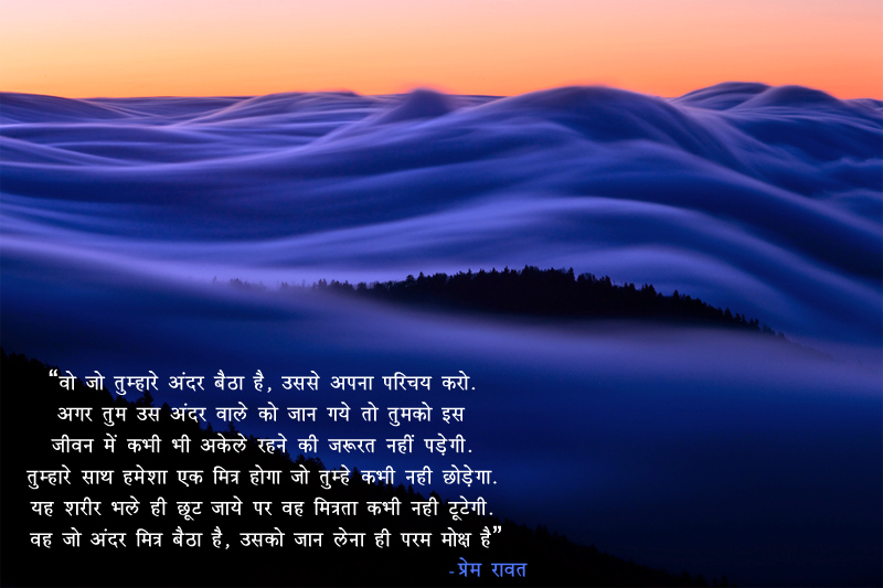 वो जो तुम्हारे अंदर बैठा है, उससे अपना परिचय करो. अगर तुम उस अंदर वाले को जान गये तो तुमको इस जीवन में कभी भी अकेले रहने की जरूरत नहीं पडे़गी. तुम्हारे साथ हमेषा एक मित्र होगा जो तुम्हे कभी नही छोडेगा यह शरीर भले ही छूट जाये पर वह मित्रता कभी नही टूटेगी. वह जो अंदर मित्र बैठा है, उसको जान लेना ही परम मोक्ष है