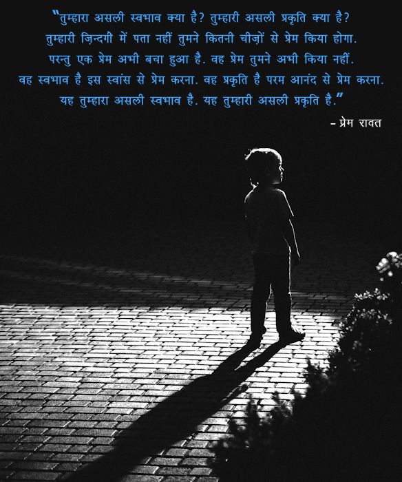 तुम्हारा असली स्वभाव क्या है? तुम्हारी असली प्रकृति क्या है? तुम्हारी ज़िन्दगी में पता नहीं तुमने कितनी चीज़ों से प्रेम किया होगा. परन्तु एक प्रेम अभी बचा हुआ है. वह प्रेम तुमने अभी किया नहीं. वह स्वभाव है इस स्वांस से प्रेम करना. वह प्रकृति है परम आनंद से प्रेम करना. यह तुम्हारा असली स्वभाव है. यह तुम्हारी असली प्रकृति है.