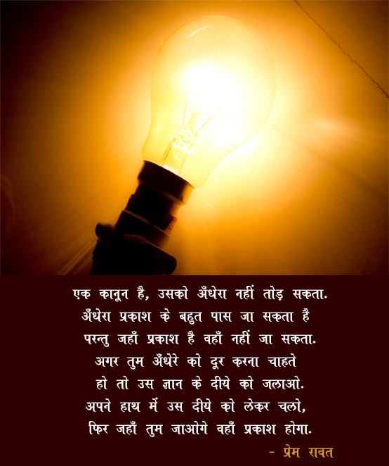 एक क़ानून है, उसको अँधेरा नहीं तोड़ सकता। अँधेरा प्रकाश के बहुत पास जा सकता है परन्तु जहां प्रकाश है वहाँ नहीं जा सकता। अगर तुम अँधेरे को दूर करना चाहते हो तो उस ज्ञान के दीये को जलाओ, अपने हाथ में उस दीये को लेकर चलो, फिर जहां तुम जाओगे वहाँ प्रकाश होगा।