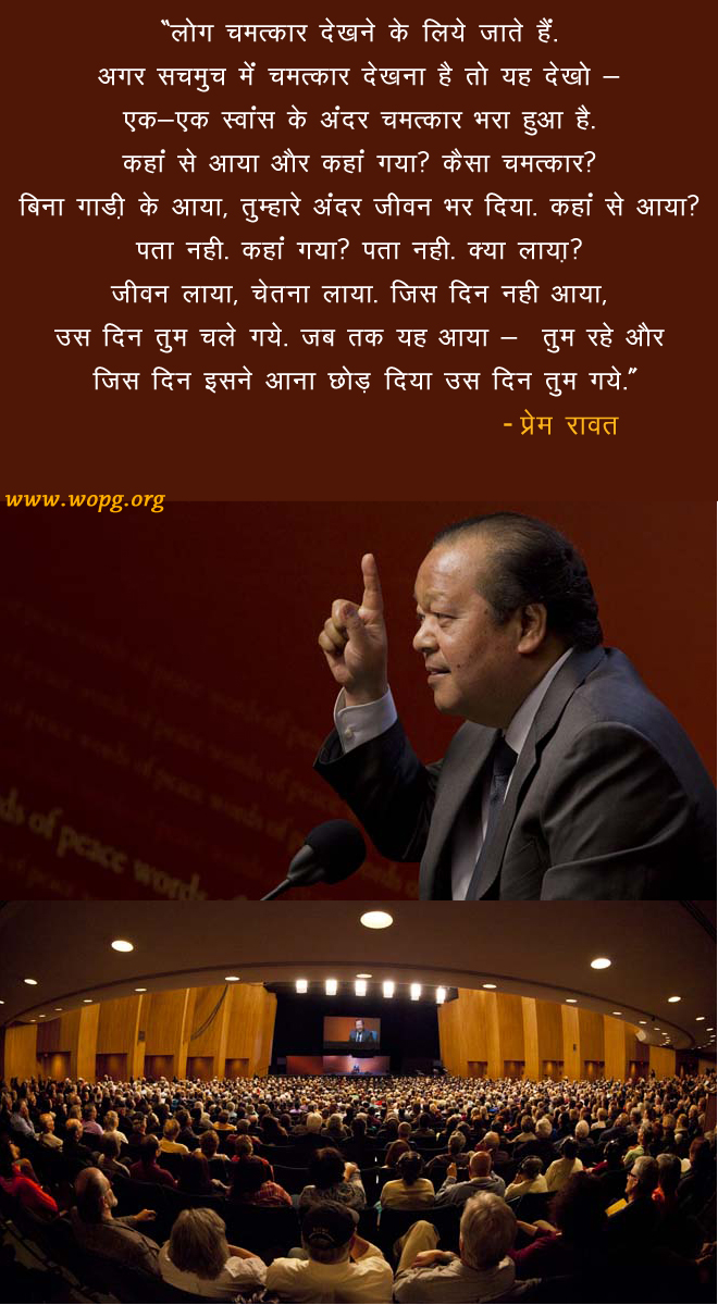 लोग चमत्कार देखने के लिये जाते हैं. अगर सचमुच में चमत्कार देखना है तो यह देखो - एक-एक स्वांस के अंदर चमत्कार भरा हुआ है. कहां से आया और कहां गया? कैसा चमत्कार? बिना गाड़ी के आया, तुम्हारे अंदर जीवन भर दिया. कहां से आया? पता नही. कहां गया? पता नही. क्या लाया? जीवन लाया, चेतना लाया. जिस दिन नही आया, उस दिन तुम चले गये. जब तक यह आया - तुम रहे और जिस दिन इसने आना छोड़ दिया उस दिन तुम गये.