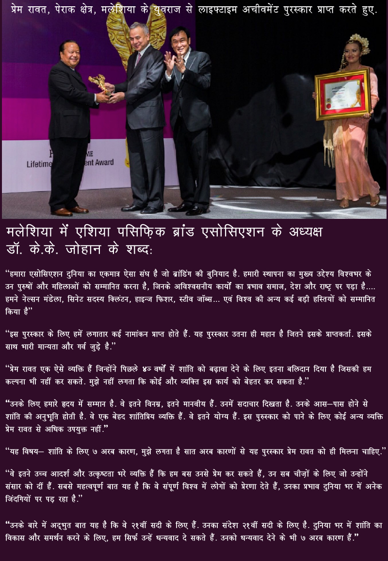 प्रेम रावत एक ऐसे व्यक्ति हैं जिन्होंने पिछले ४० वर्षों में शांति को बढ़ावा देने के लिए इतना बलिदान दिया है जिसकी हम